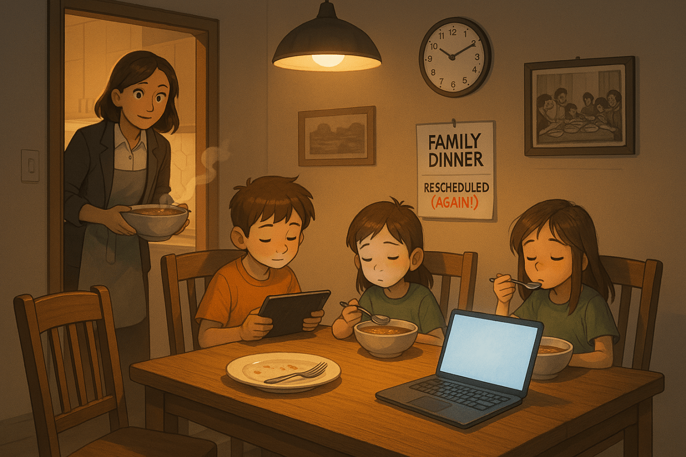 I do try to preserve the essence of these traditions. I really do. But somewhere between Zoom calls, school runs, and surviving the Monday blues, the sacred family meal often gets postponed… indefinitely. “We’ll all sit and eat dinner together tonight,” I declare with noble intent. But by 9:30 PM, the kids have already foraged through the fridge like wild raccoons.