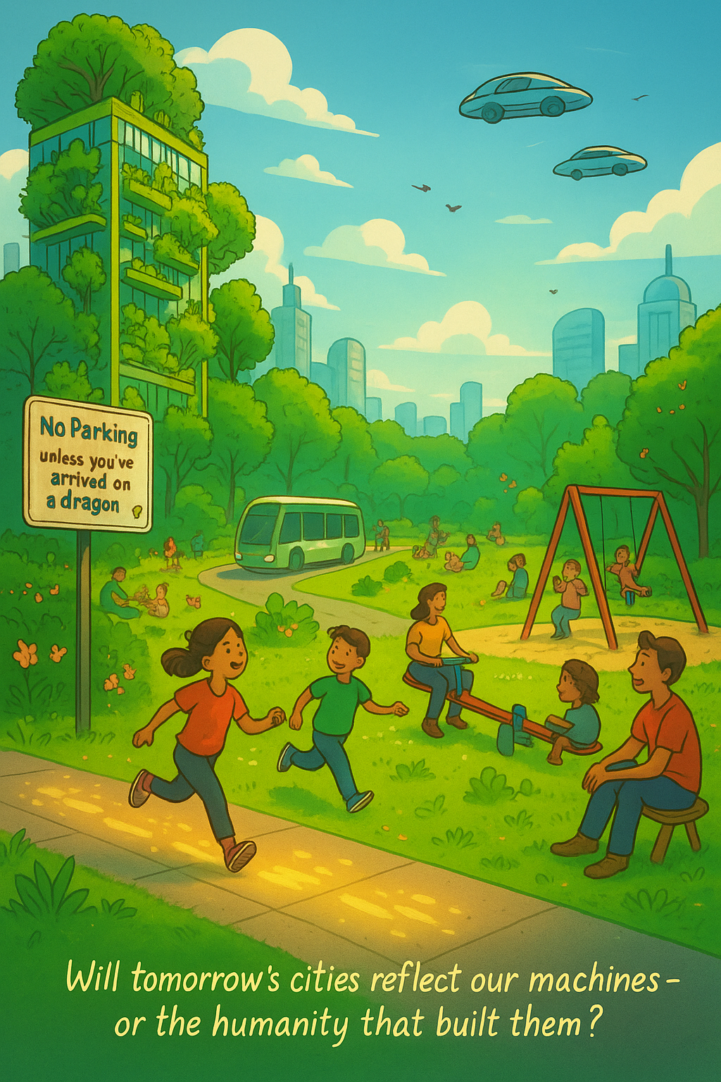 Greenery will no longer be a luxury; it will be the city’s heartbeat. Parks will spill into every corner, and trees will be neighbors who never complain about the noise. Children’s laughter will echo from playgrounds at every turn, while adults rediscover swings, slides, and sandpits—because who said growing up means giving up play?