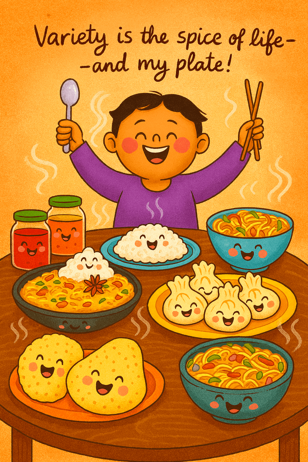 “Food is the only thing that’s both universal and personal,” and that’s exactly why I love exploring everything. One minute I’m happily munching on dal-rice with pickle and pappad, enjoying the comfort of home-cooked goodness. The next, I’m diving headfirst into a plate of spicy biryani or savoring those juicy momos dripping with sauce. And Chinese food? Well, that’s just the wild card that always spices up the party.